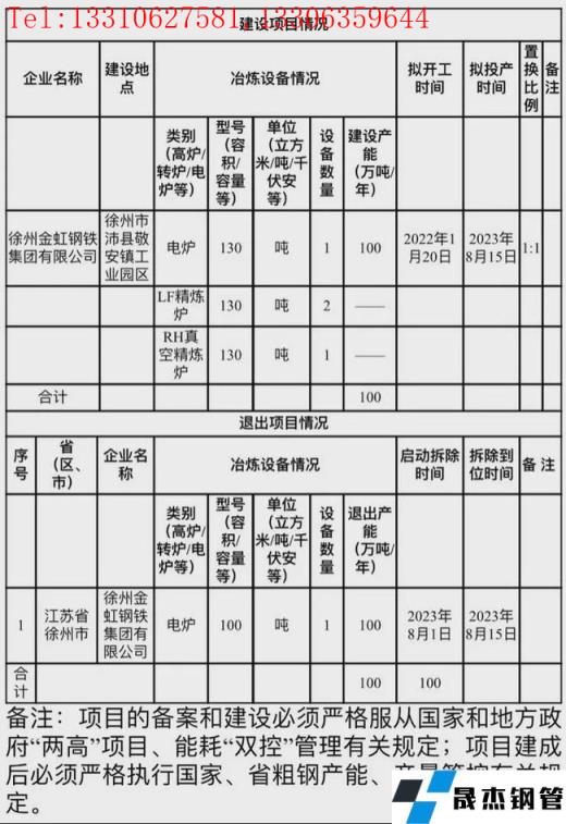 12月24日,江蘇省工信廳發布徐州金虹鋼鐵集團有限公司電爐改造項目產能置換方案。方案表明,徐州金虹鋼鐵集團有限公司擬於2022年1月20日在徐州市沛縣敬安鎮工業園區內新建130t電爐1座,產能100萬噸/年;130tLF精煉爐2座,130tRH真空精煉爐1座,預計2023年8月15日投產。同時計劃退出100t電爐1座,產能100萬噸/年,並於2023年8月1日啟動拆除,2023年8月15日拆除到位。