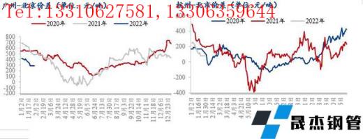 1月份廣州、杭州市場市場價格漲幅緩慢,北京市場價格漲幅居前,因此廣州-北京、杭州-北京市場的區域價差均有所收窄。目前廣州-北京價差在300元/噸左右,此價差略低於2020年、2021年同期水平,且結合無縫草莓视频在线观看APP鋼管廠家的政策以及運費來看此價差也不足以吸引北方區域資源南下廣州。目前杭州-北京價差不足100元/噸,因北京價格相對高位,加之東北區域節後需求啟動較晚,因此東北區域部分無縫草莓视频在线观看APP鋼管廠家傾向於把資源投放至北京區域,其中西林、新撫鋼甚至於海鑫都有此安排。