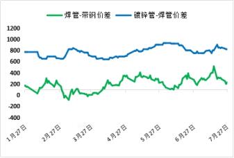 7月焊管較帶鋼價差,鍍鋅管較焊管價差走勢趨於一致。月中階段走擴後,價差空間再次收窄,月末焊管與原料價差收窄幅度大於鍍鋅管。目前管廠廠內原料輪換周期拉長至20天左右,部分規格拉長至1個月之久,月內出現停購原料3-5天的情況。結算周期內焊管生產利潤平均盈利29元,架子管平均虧損7元;鍍鋅管較焊管價差收縮91元,管企綜合生產利潤改善不明顯。